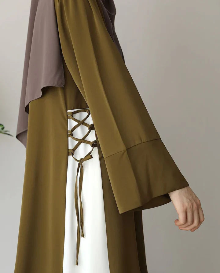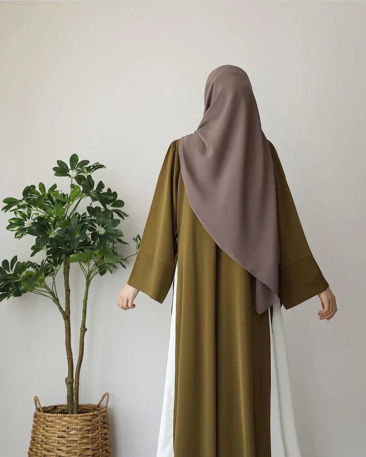 Design: Classic Gold abaya with contrast accents on cuffs; paired with a soft grey hijab.