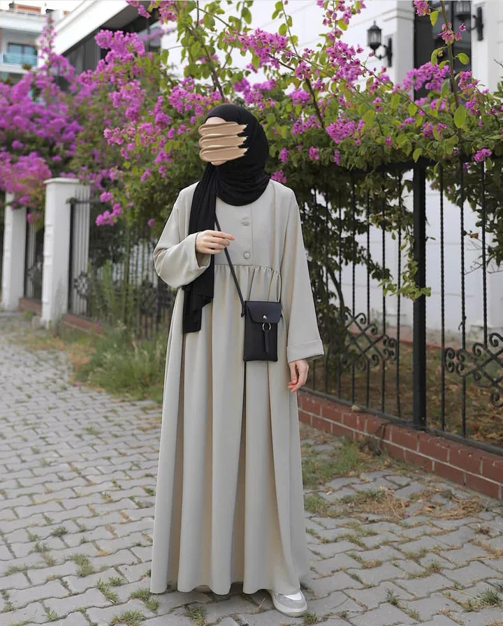 Design: Classic grey abaya with contrast accents on cuffs; paired with a soft grey hijab.