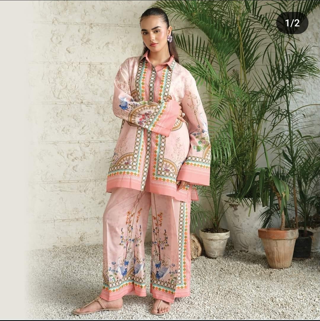 This classic coord set features subtle contrast accents on the cuffs, adding a touch of sophistication. It comes paired with a soft georgette to complete the look.