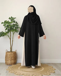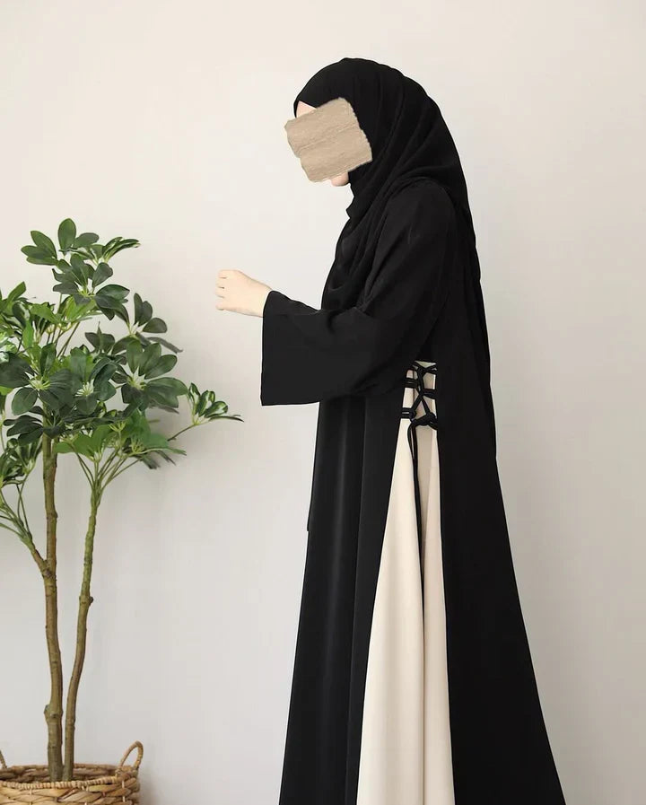 Design: Classic Black abaya with contrast accents on cuffs; paired with a soft grey hijab.